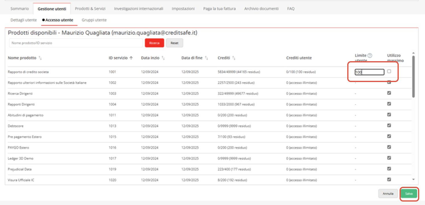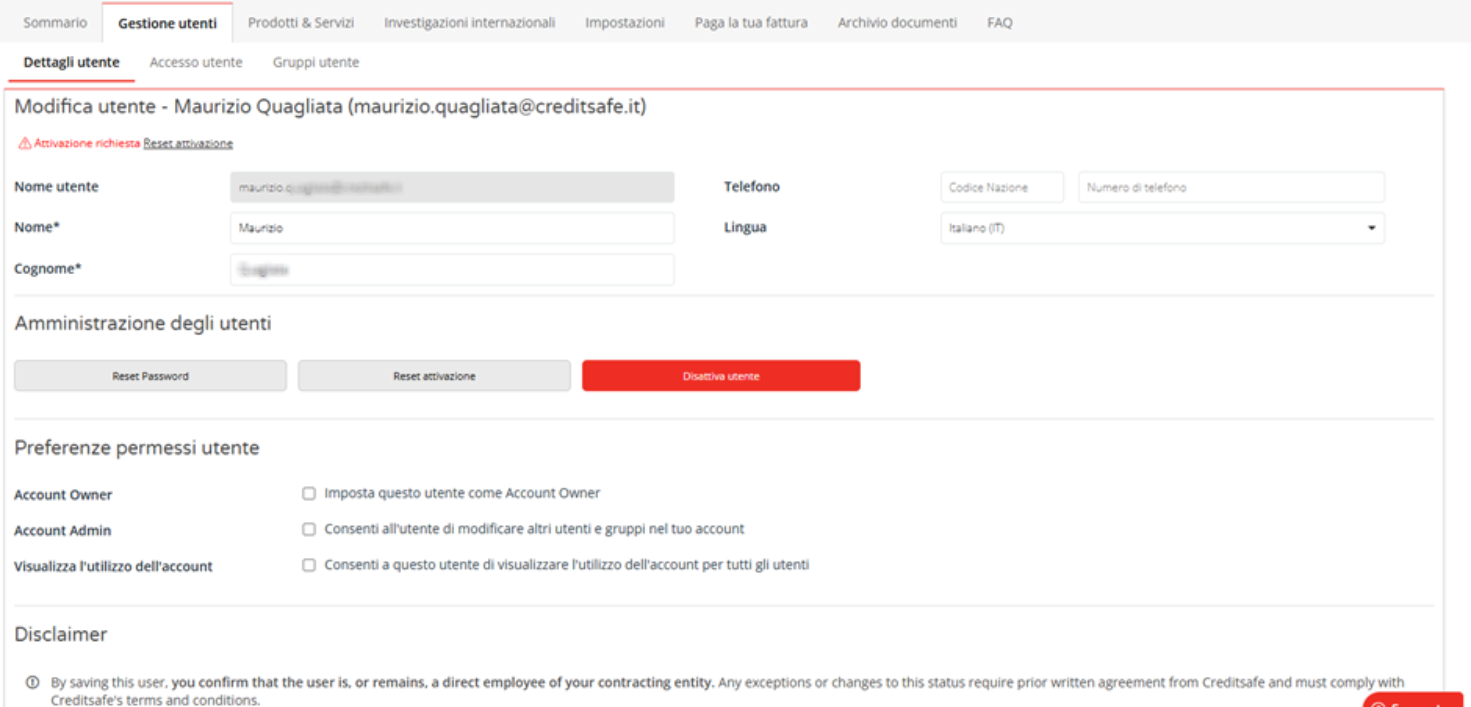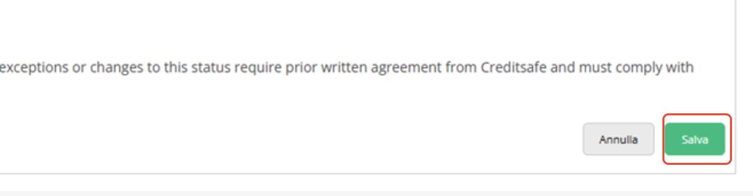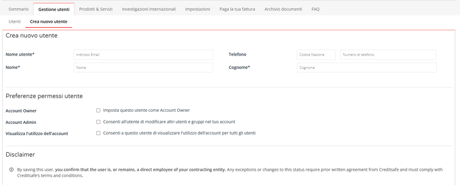 Salvando questo utente, confermi che l'utente è, o rimane, un dipendente diretto del tuo ente contraente. Qualsiasi eccezione o modifica a questo stato richiede il previo consenso scritto di Creditsafe e deve essere conforme ai termini e alle condizioni di Creditsafe.