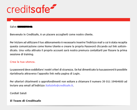 Il nuovo utente riceverà una mail contenente il link per l’attivazione che dovrà compilare in tutti i suoi campi e sul quale potrà impostare la password.