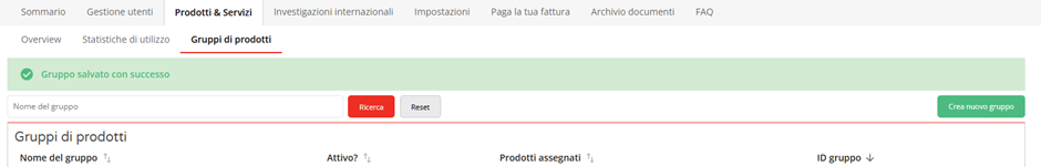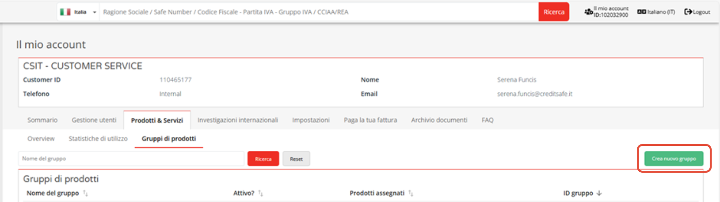 Per creare un nuovo Gruppo, sempre dalla sezione “Il Mio Account”, si accede alla sezione “Prodotti & servizi” à “Gruppi di Prodotti” e si clicca su Crea Nuovo Gruppo: