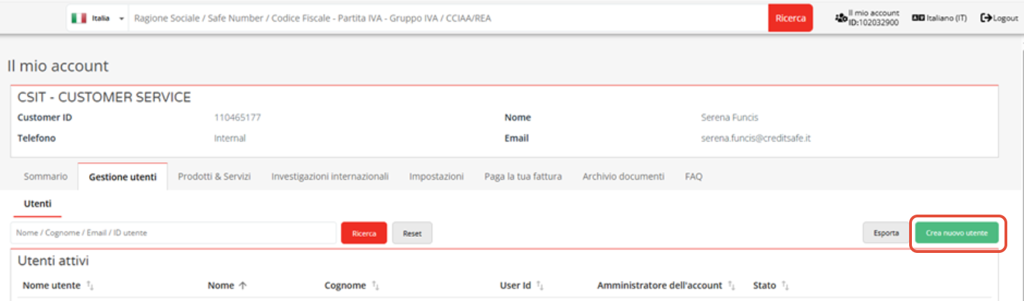 Contatta il nostro Customer Support Team indicando il nome e l'indirizzo e-mail della persona che vorresti aggiungere al tuo account. Puoi contattare il Team inviando un'e-mail a italiainfo@creditsafe.it oppure aprire un ticket. Ti preghiamo di ricordare che, in base al pacchetto Creditsafe che hai acquistato, potrebbero essere addebitati costi aggiuntivi se aggiungi altri utenti.