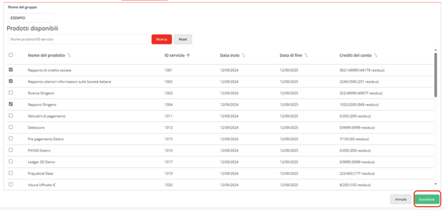 Per la compilazione è necessario inserire il Nome del Gruppo e spuntare le apposite caselle corrispondenti ai servizi da abilitare e cliccare su successivo: